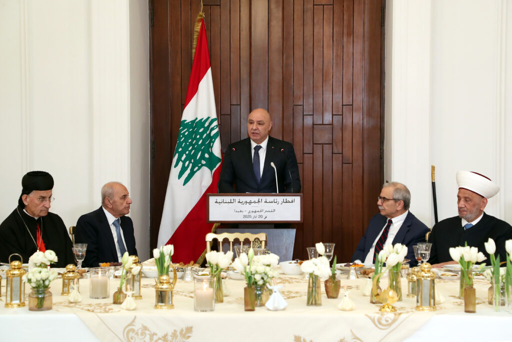 كلام الرئيس عون جاء خلال مأدبة الافطار الرمضاني التي اقامها غروب اليوم في قصر بعبدا، وفق التقليد السنوي الذي غاب قسرياً لسنوات بسبب الازمات التي حلّت بلبنان من جهة، والفراغ الرئاسي الذي شهده البلد من جهة اخرى.وشارك في الافطار رئيس مجلس النواب نبيه بري، رئيس مجلس الوزراء نواف سلام، الرئيس العماد ميشال عون، نائب رئيس مجلس النواب الياس بو صعب، نائب رئيس مجلس الوزراء طارق متري، رؤساء الحكومات السابقين: نجيب ميقاتي، فؤاد السنيورة، تمام سلام، وحسان دياب، وزراء ونواب، ورؤساء احزاب. وحضر من رؤساء الطوائف المسيحية: البطريرك الماروني مار بشارة بطرس الراعي، بطريرك انطاكيا وسائر المشرق للروم الكاثوليك مار يوسف الأول العبسي، بطريرك انطاكيا وسائر المشرق للروم الأرثوذكس يوحنا العاشر اليازجي، بطريرك الأرمن الكاثوليك البطريرك روفائيل بيدروس الحادي والعشرون مينسيان، كاثوليكوس الأرمن الأرثوذكس آرام الأول كيشيشيان، بطريرك السريان الكاثوليك مار اغناطيوس يوسف الثالث يونان، بطريرك انطاكيا وسائر المشرق للسريان الأرثوذكس مار اغناطيوس افرام الثاني، رئيس الطائفة الكلدانية في لبنان المطران ميشال قصارجي، رئيس الطائفة القبطية الارثوذكسية في لبنان وسوريا القمص اندراوس الانطوني، رئيس الطائفة الانجيلية في لبنان وسوريا القس جوزف قصاب، النائب الرسولي للاتين في لبنان المطران سيزار اسايان. وحضر من رؤساء الطوائف الاسلامية: مفتي الجمهورية الشيخ عبد اللطيف دريان، نائب رئيس المجلس الاسلامي الشيعي الأعلى الشيخ علي الخطيب، شيخ عقل الطائفة الدرزية سامي ابي المنى، رئيس المجلس الاسلامي العلوي الشيخ علي قدور، اضافة الى عدد من المطارنة والمشايخ، والسفير البابوي في لبنان المونسنيور باولو بورجيا، ورؤساء البعثات الدبلوماسية العربية والاسلامية، عميد السلك القنصلي جوزف حبيس، رؤساء السلطات القضائية، قادة الاجهزة العسكرية والامنية، السلك الاداري، المحافظون، واعضاء من لجنة الحوار الاسلامي المسيحي، ونقباء المهن الحرة، مدراء وامناء عامون، كبار الموظفين والمستشارين في القصر الجمهوري.وقبل مشاركتهم في مأدبة الافطار توجه عدد من المشاركين، يتقدمهم مفتي الجمهورية، الى صالون السفراء في القصر الجمهوري الذي خصص لتأدية الصلاة.لقاء ثلاثيوسبق الافطار، لقاء ضم الرئيس عون والرئيسين بري وسلام، تطرق الى الاوضاع الراهنة في البلاد، وخصوصاً الوضع في الجنوب وعلى الحدود الشرقية والشمالية- الشرقية، ووجوب إعادة الهدوء والاستقرار اليها.وبعد انتهاء اللقاء الثلاثي، انتقل الجميع الى قاعة 25 ايار حيث اقيمت مأدبة الافطار الرمضاني.